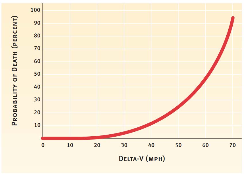 Observe en el gráfico anterior que una velocidad de impacto de 70 mph tiene una probabilidad de muerte de casi el 100%. Eso podría ser un conductor que golpea un árbol a 70 mph, o podrían ser dos conductores que viajan a 35 mph y chocan de frente.